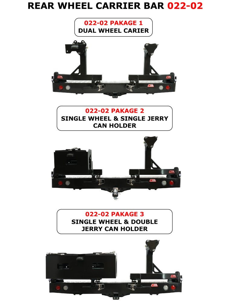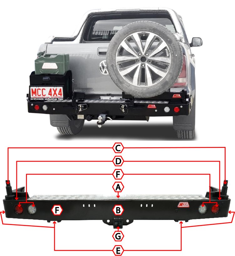 ADR Approved, the MCC Rear Carrier Bar is both tough and functional. With a semi gloss powder coated finish, LED number plate lamps, dual LED reverse, indicator & combination stop/tail lamps, pre-drilled universal parking sensor holes and non-slip checker plate step, this bar was built for the serious 4x4 enthusiast. Dual Wheel ,Single Jerry Can and Dual Jerry Can options are available.